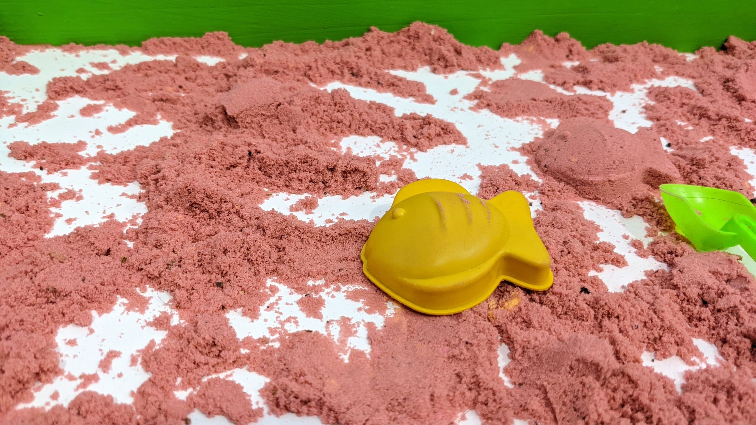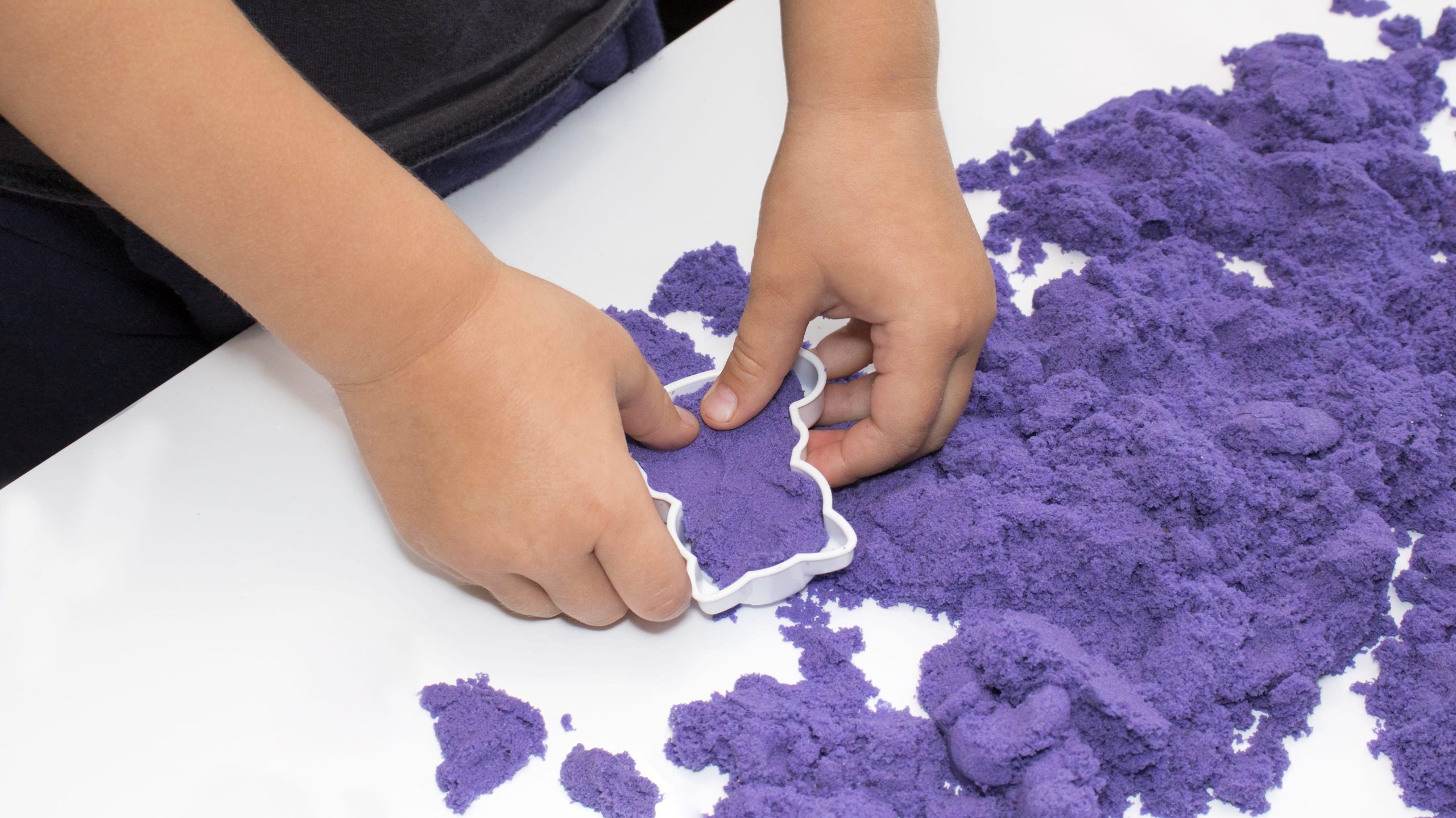 Choose a shallow bin, tray or sensory tub and put the kinetic sand in a contained space.