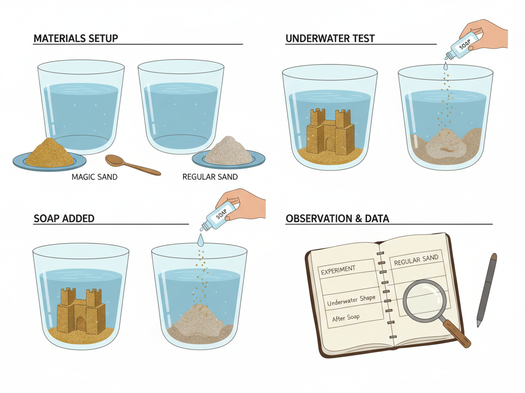 Magic sand looks like a trick, but it demonstrates a real materials concept: hydrophobic surfaces resist wetting. In this science project, you will compare magic sand vs regular sand using controlled tests, record results, and explain what changes when you disrupt the effect with dish soap.