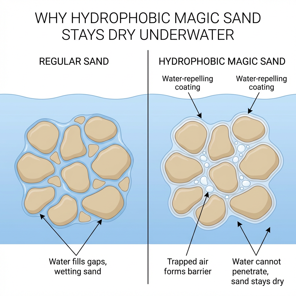 Magic sand is regular sand coated with a water-repelling material. That coating changes how water interacts with each grain, so the sand can stay dry even when it sits underwater.